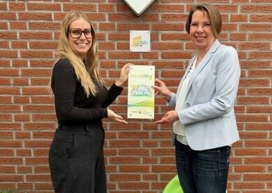 Vanessa Drösser (rechts im Bild) überreichte als Landeskoordinatorin in Vertretung der gesetzlichen Krankenkassen das Zertifikat „Pluspunkt Ernährung“ an Michelle Malacasa.
